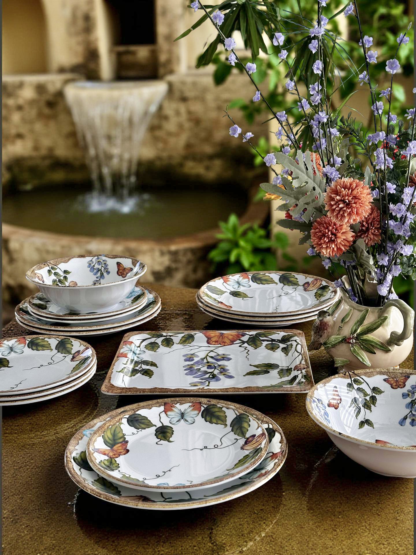 Fiorito Serisi, İtalyan bahçelerinin zarafetinden ilham alan desenleriyle sofralara doğal bir şıklık kazandırır. Asma yaprakları ve kelebek detaylarıyla bezeli bu özel seri, melamin malzemenin hafifliği ve dayanıklılığıyla estetikle fonksiyonelliği bir araya getirir.