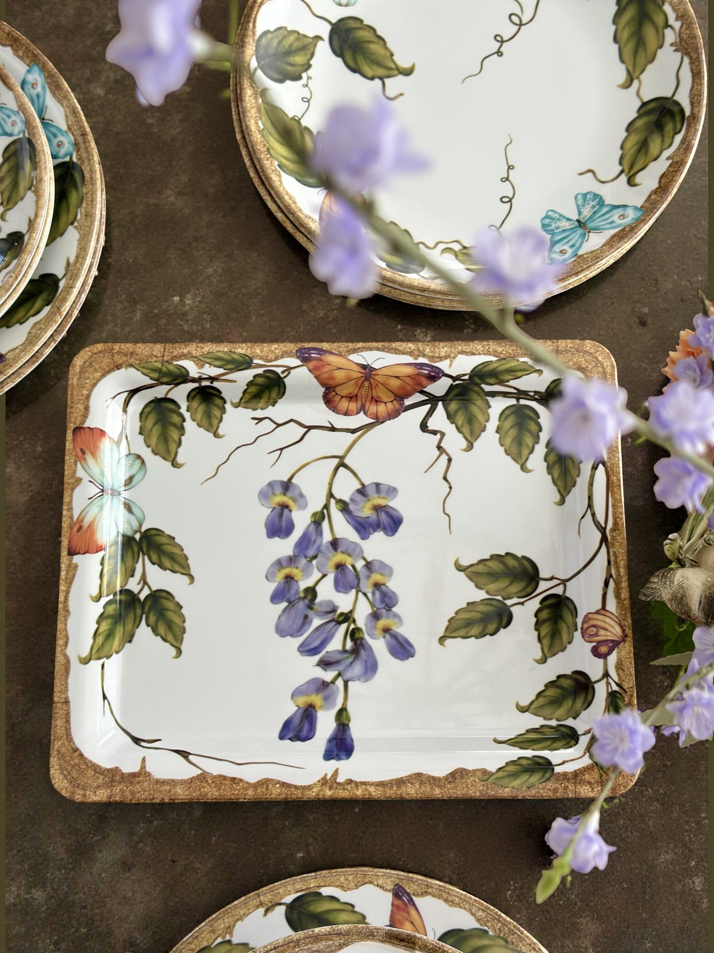 Fiorito Serisi, İtalyan bahçelerinin zarafetinden ilham alan desenleriyle sofralara doğal bir şıklık kazandırır. Asma yaprakları ve kelebek detaylarıyla bezeli bu özel seri, melamin malzemenin hafifliği ve dayanıklılığıyla estetikle fonksiyonelliği bir araya getirir.