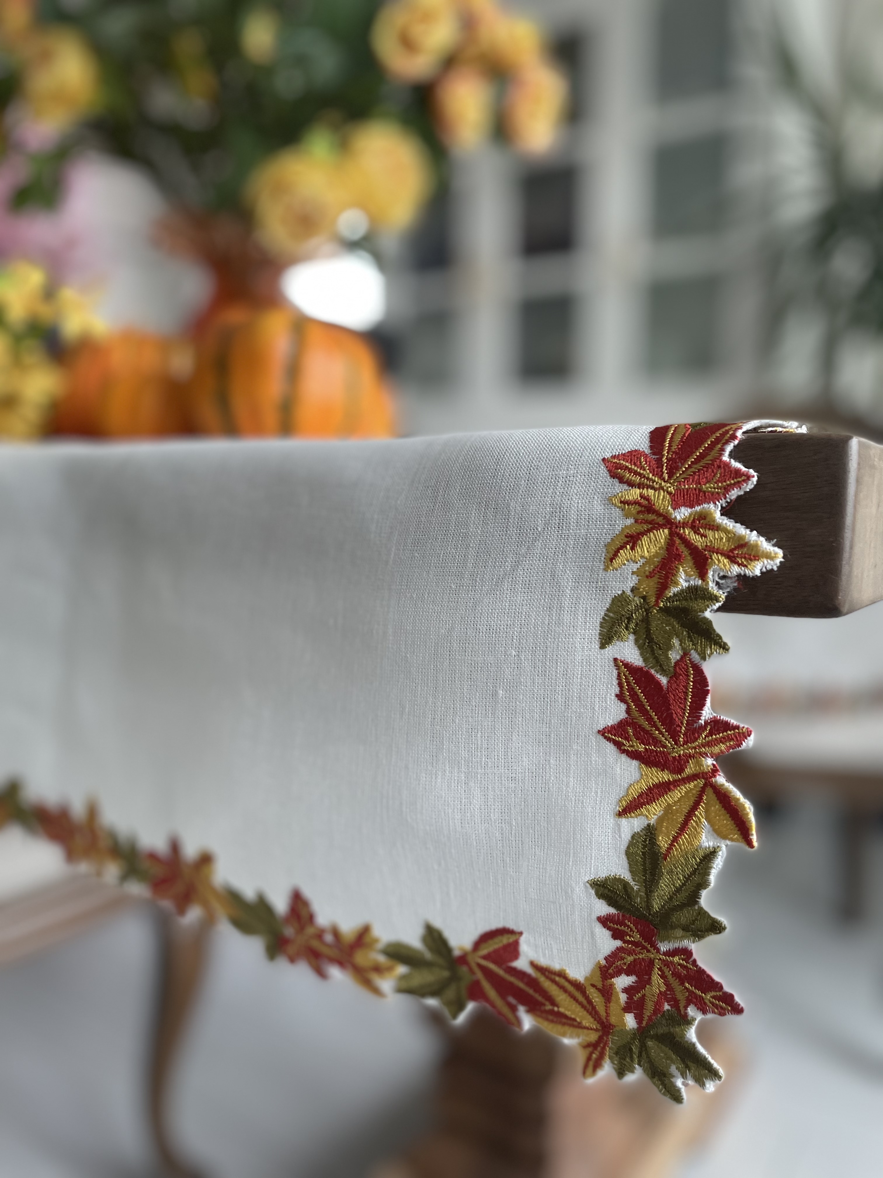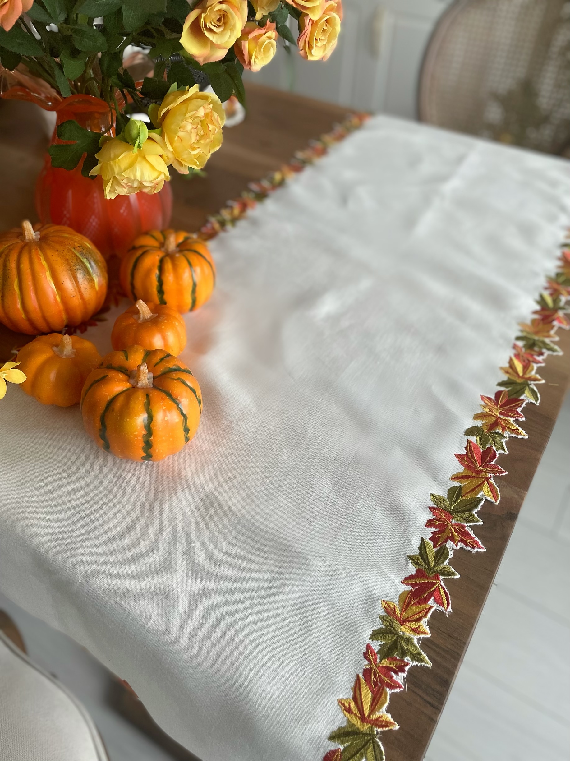 %100 Keten Kumaş Çevresine Yaprak Nakışlı Runner