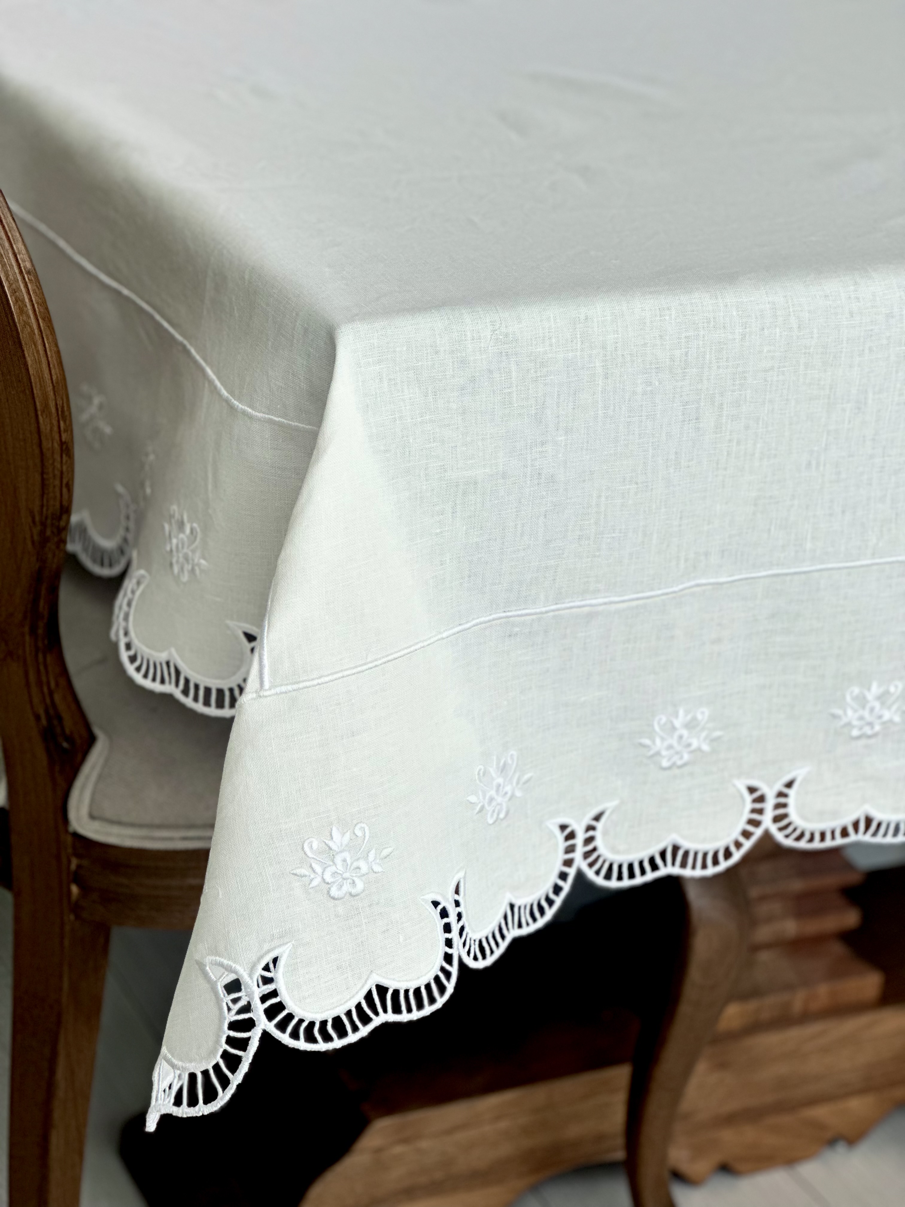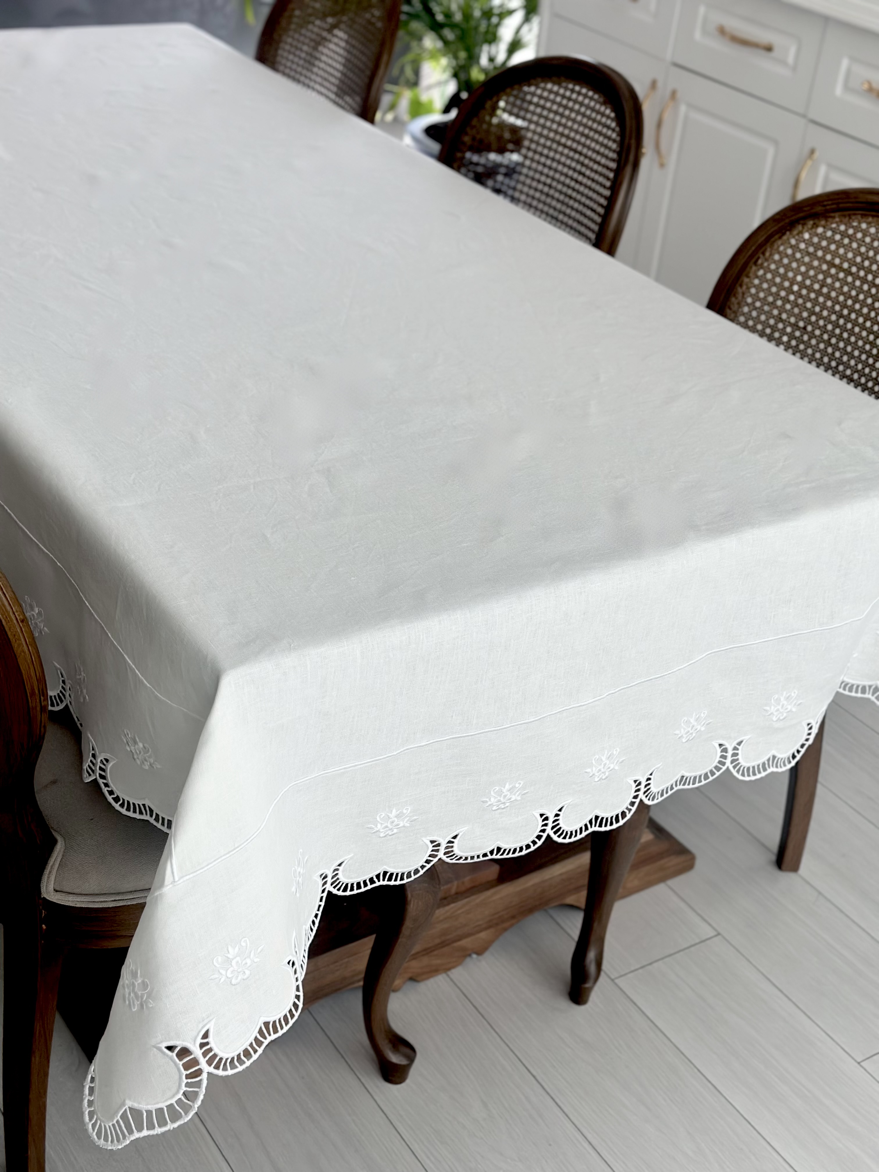 %100 keten kumaş üzerine beyaziş nakışlı masa örtüsü