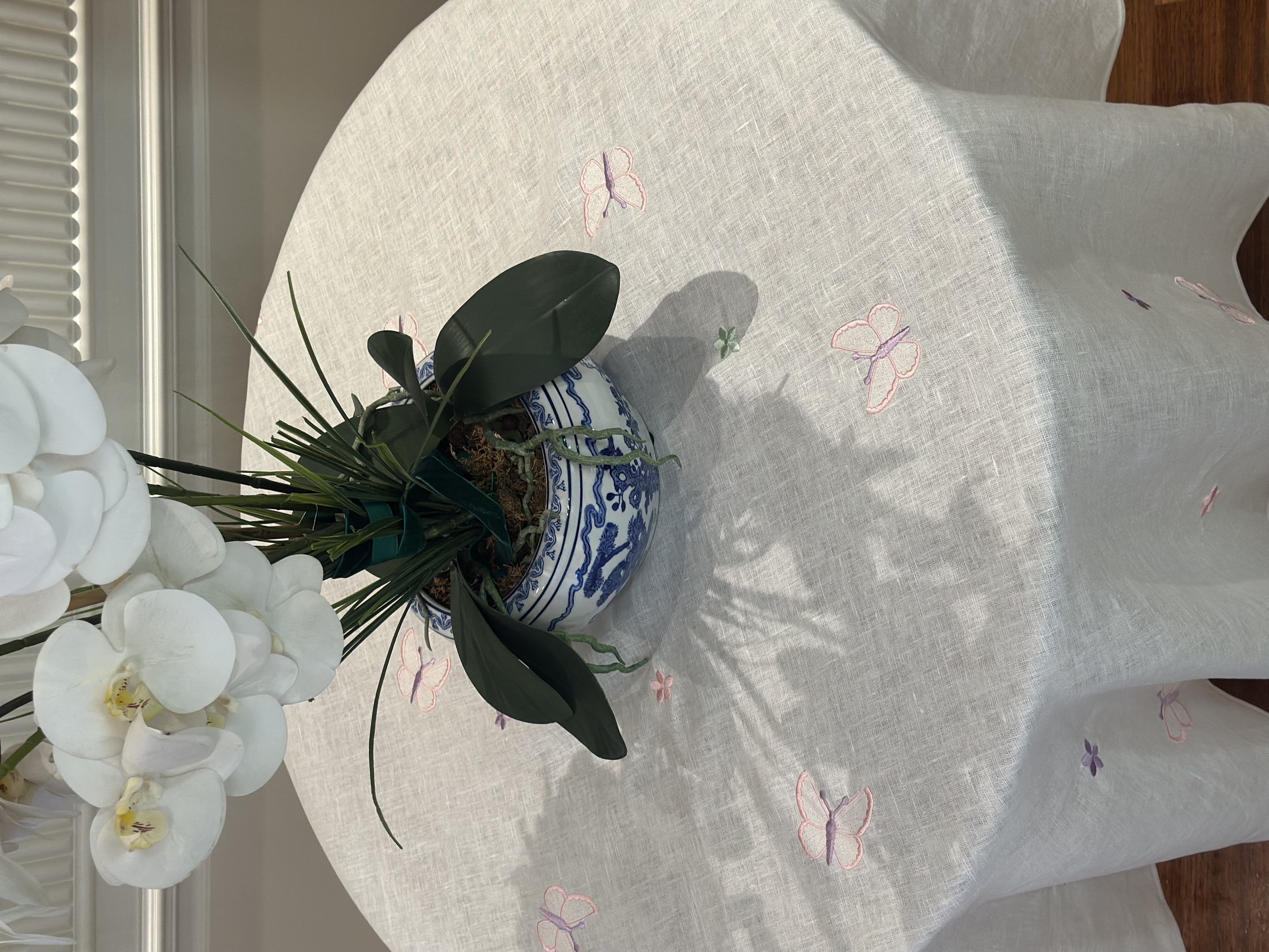 %100 keten kumaşın üzerine serpme kelebek nakışlı masa örtüsü