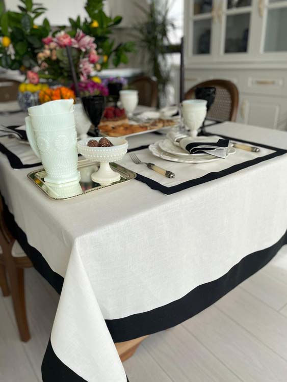 %100 Keten Siyah Şeritli Masa Örtüsü