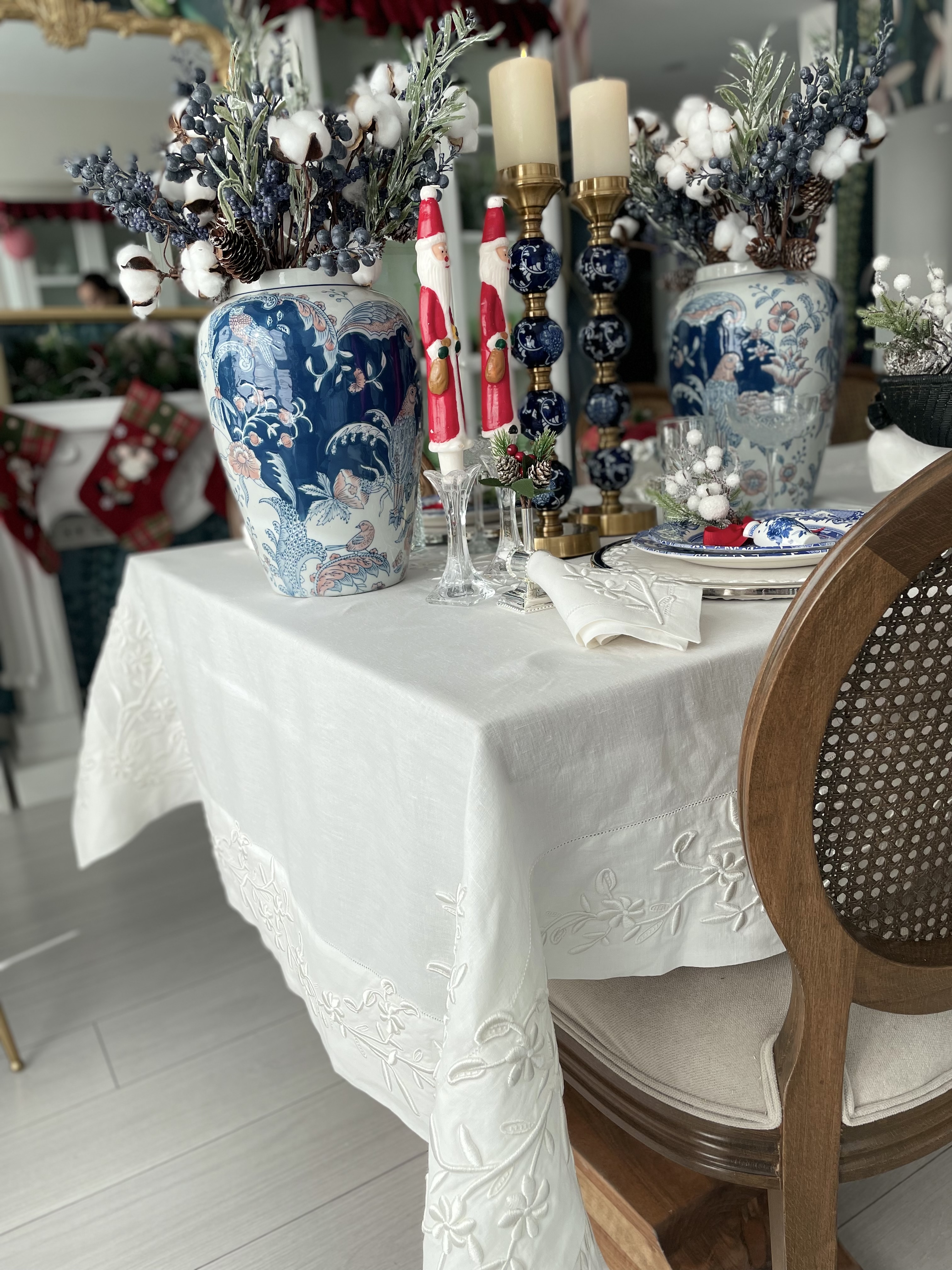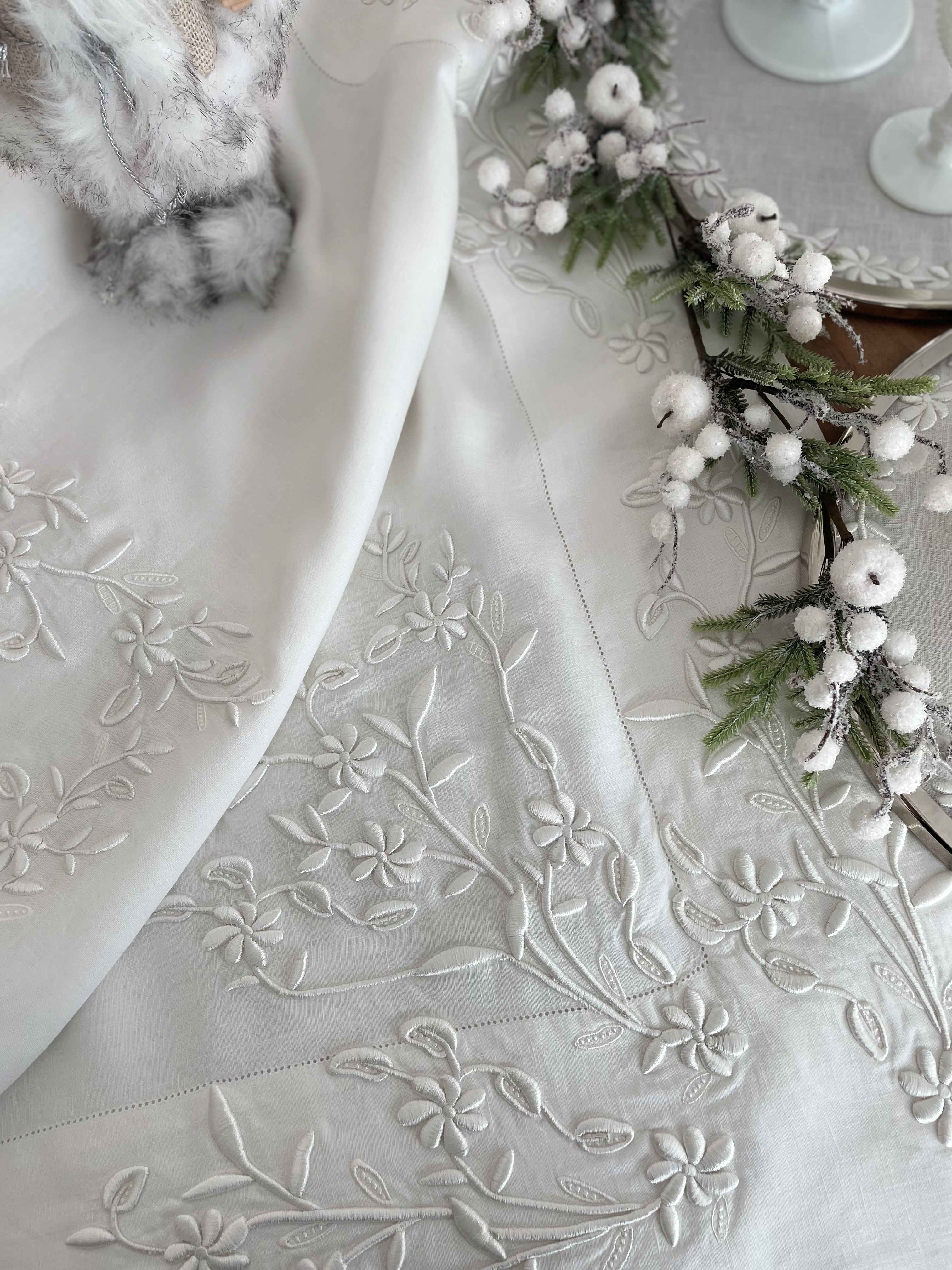 250-150 cm Kabartma Nakışlı %100 Keten Masa Örtüsü