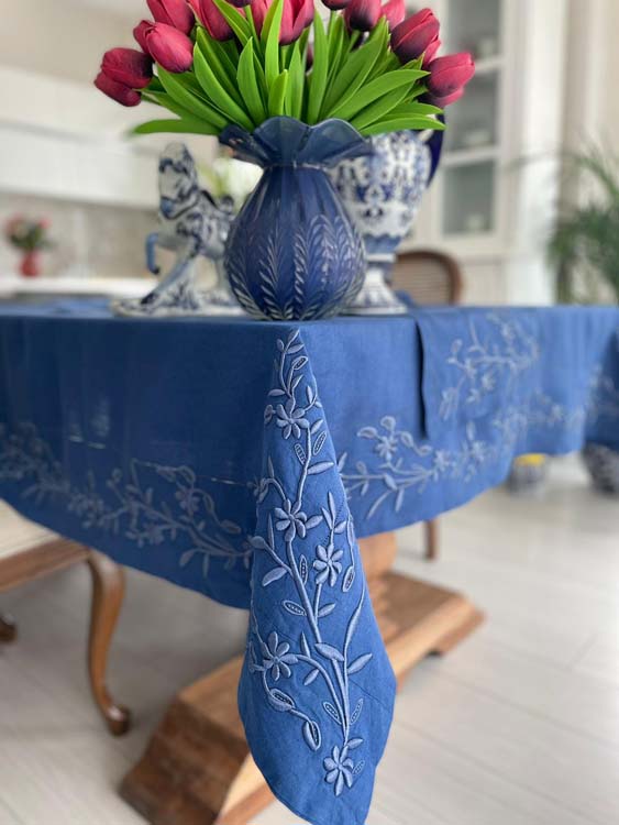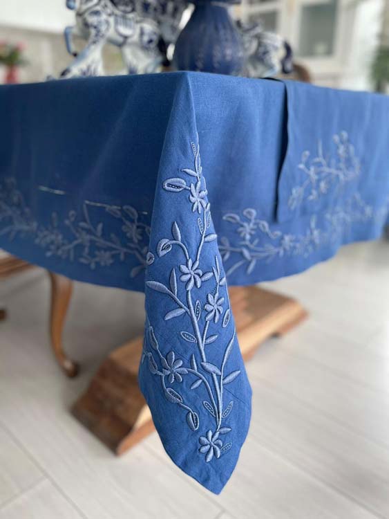 250-150 cm Kabartma Nakışlı %100 Keten Masa Örtüsü