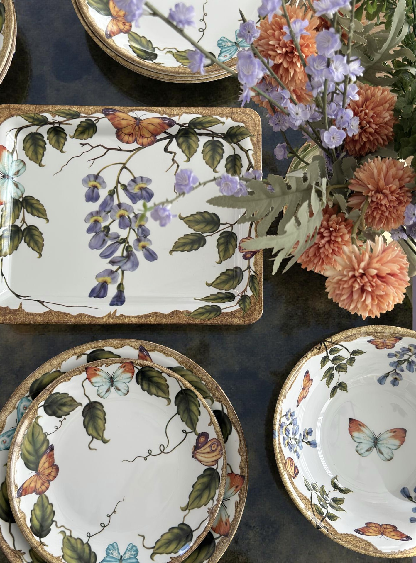 Fiorito Serisi, İtalyan bahçelerinin zarafetinden ilham alan desenleriyle sofralara doğal bir şıklık kazandırır. Asma yaprakları ve kelebek detaylarıyla bezeli bu özel seri, melamin malzemenin hafifliği ve dayanıklılığıyla estetikle fonksiyonelliği bir araya getirir.